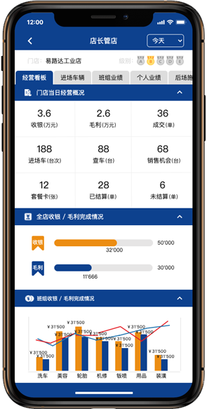 经营看板、班组数据、个人业绩、后场施工...... 数据可视化功能让数据不再枯燥,店长轻松管理门店。