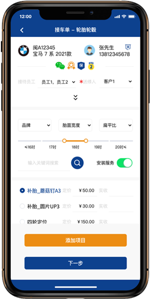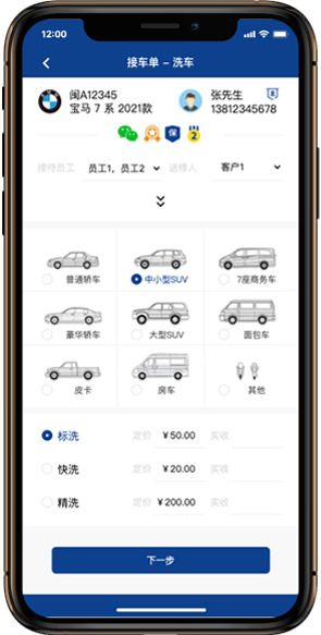 扫描车牌,一键开单。洗车、美容、轮胎等高频业务类型,自定义快速开单项目,快选车辆类型,效率翻倍。